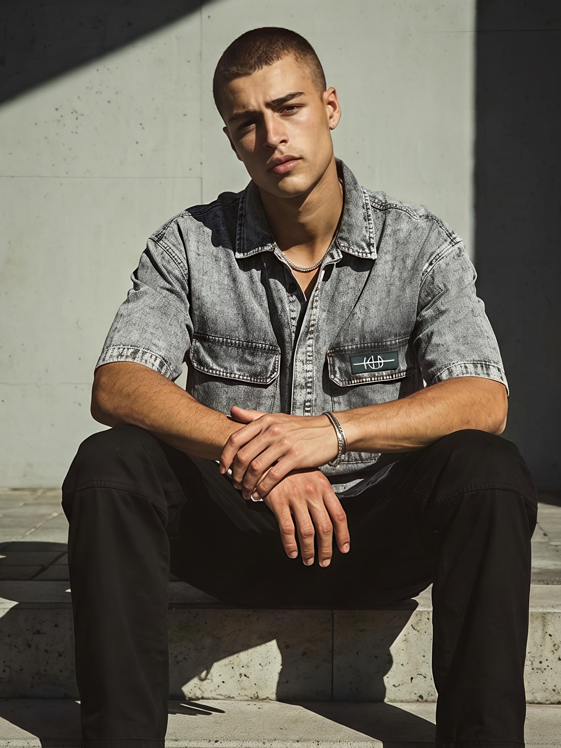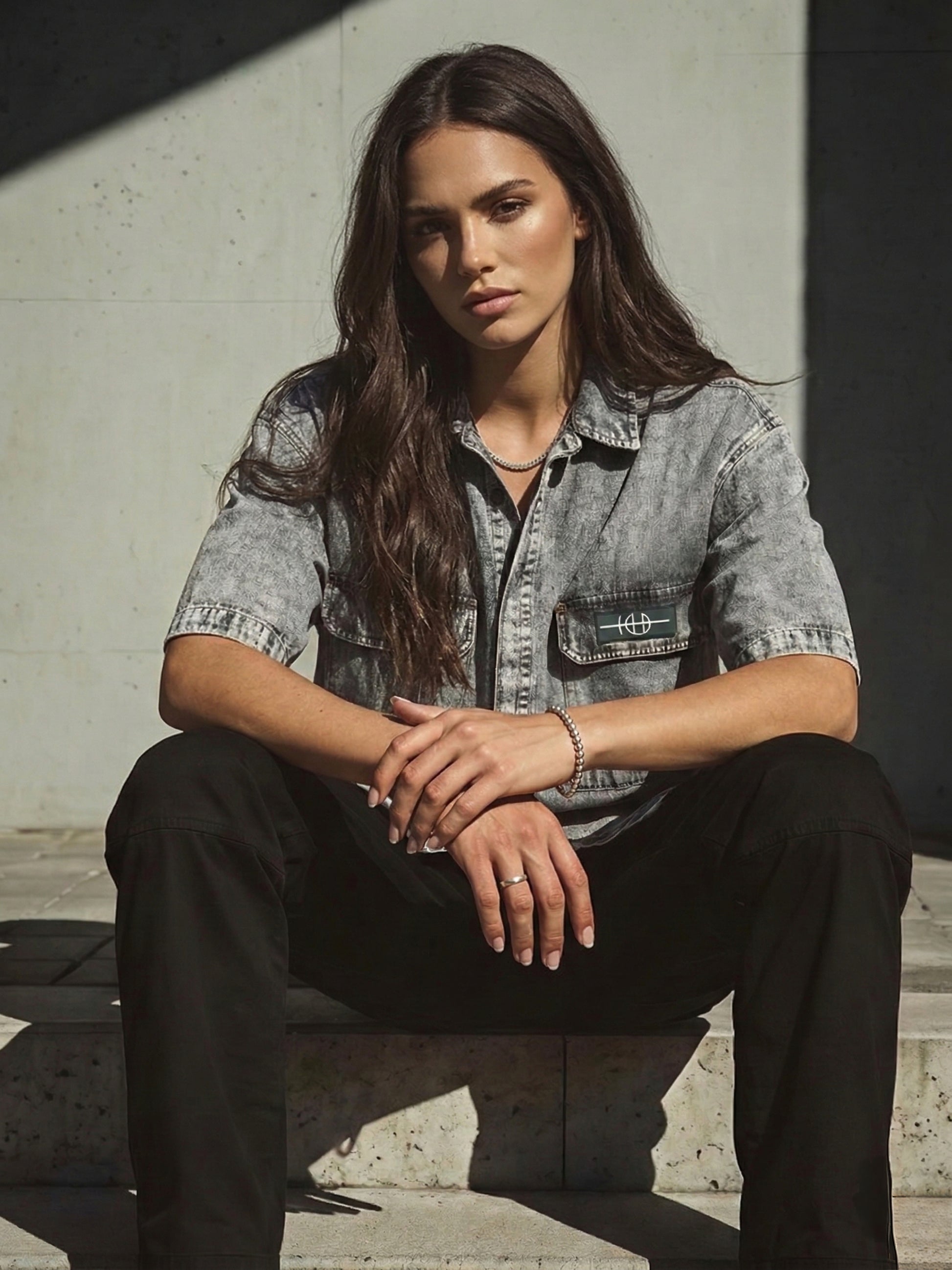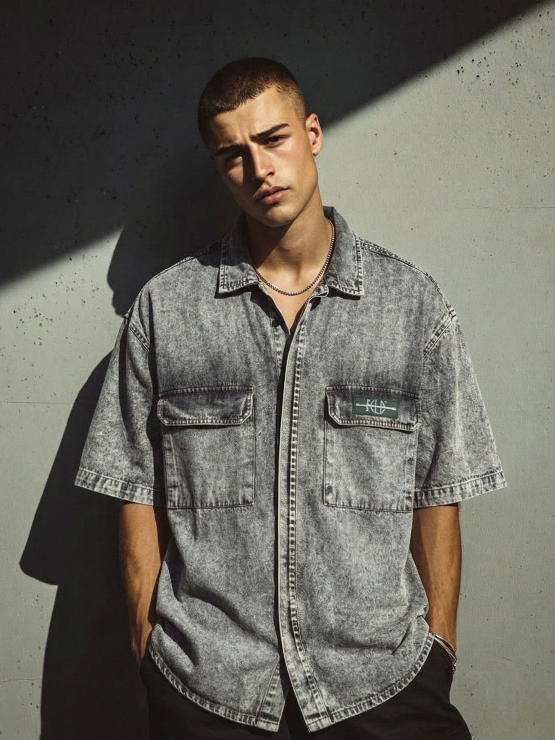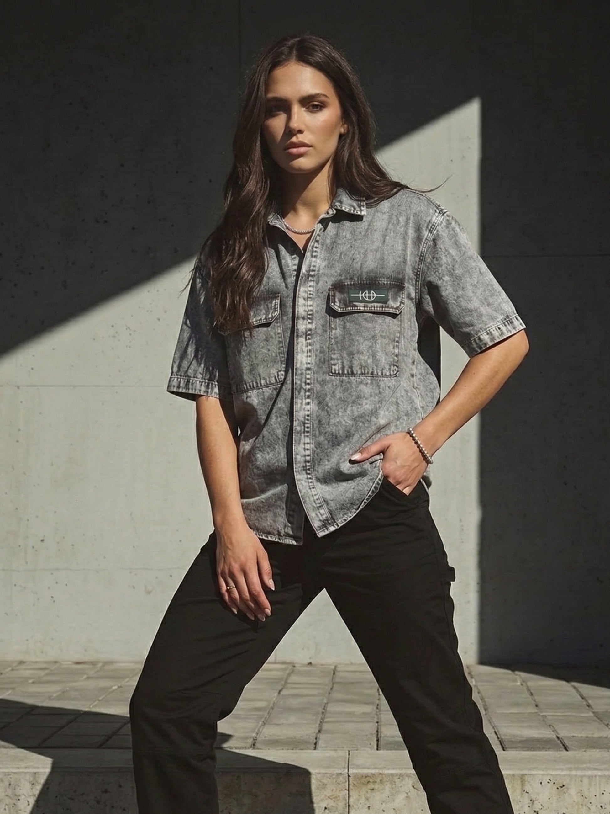 Elevate your style with our Cotton Denim Acid Wash Oversized Shirt, designed for those who embrace bold fashion with effortless comfort. Crafted from premium cotton denim, this half-sleeve shirt features a unique acid-wash finish, giving it a rugged yet stylish edge. Equipped with double front pockets, one adorned with a signature silicon label showcasing a sword—a powerful emblem of Colada, making it a perfect go-to piece for layering or a standout on its own.