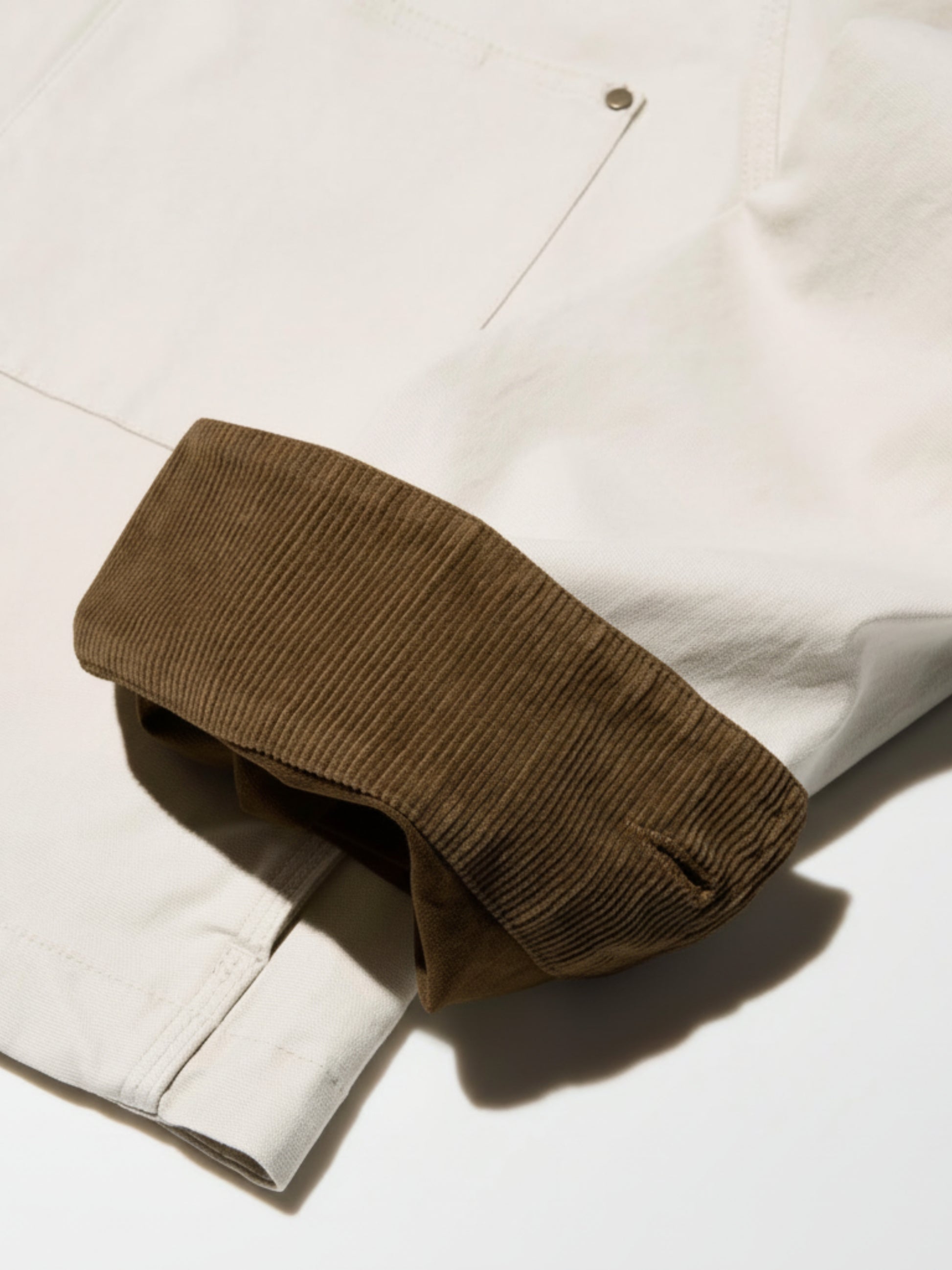 • Dark brown suede-finish collar and sleeve cuffs add a sophisticated textural contrast.